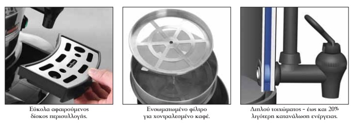 - Έως 20% μικρότερη κατανάλωση ρεύματος συγκριτικά με παρόμοιες καφετιέρες φίλτρου μονού τοιχώματος