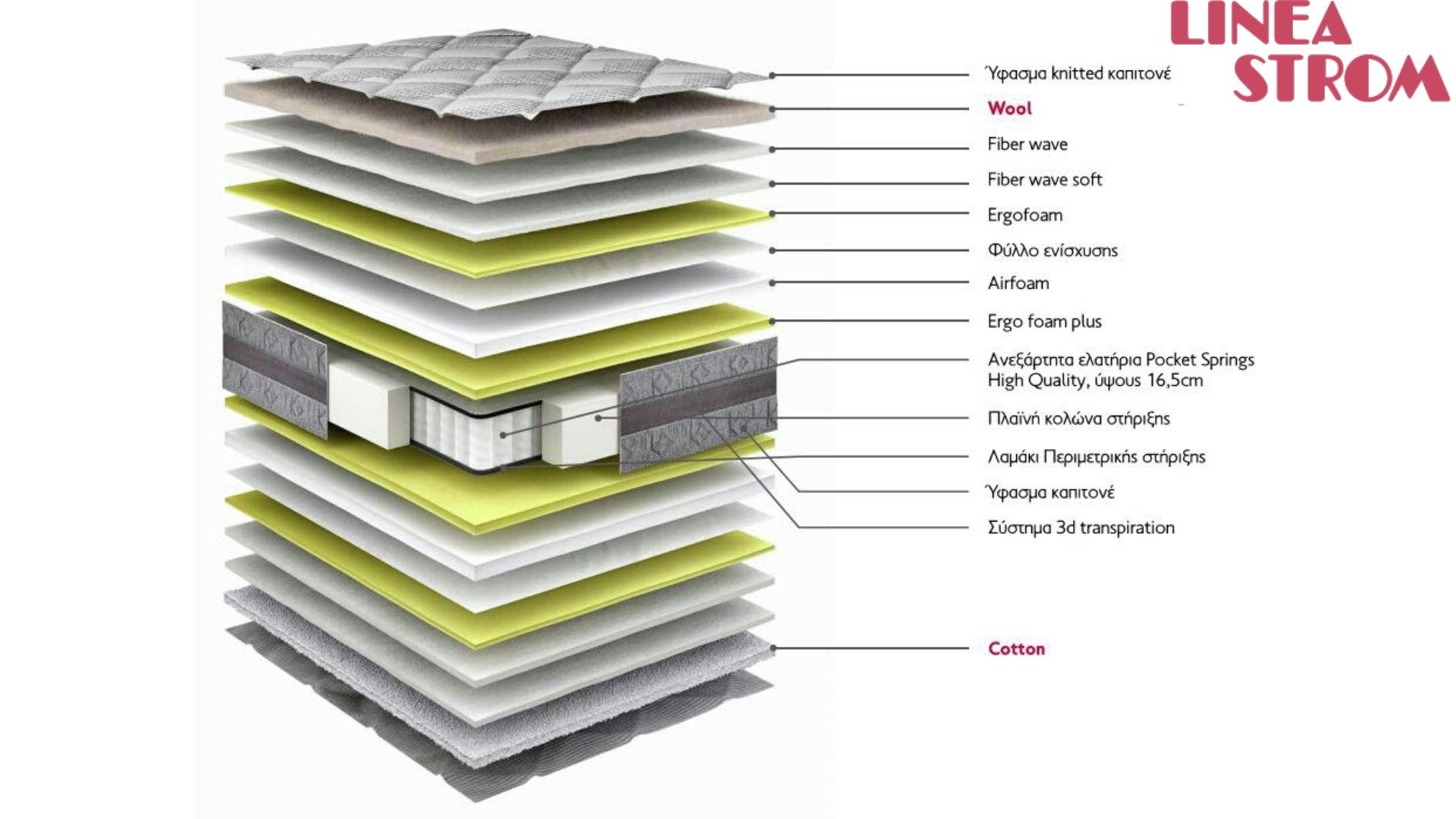 Ένα στρώμα ανατομικό με ελατήρια Pocket Springs High Quality μέτριας σκληρότητας με αρκετές στρώσεις υλικών και είναι ντυμένο με υψηλής ποιότητας knitted ύφασμα καπιτονέ πιστοποιημένο με ECOTEX.