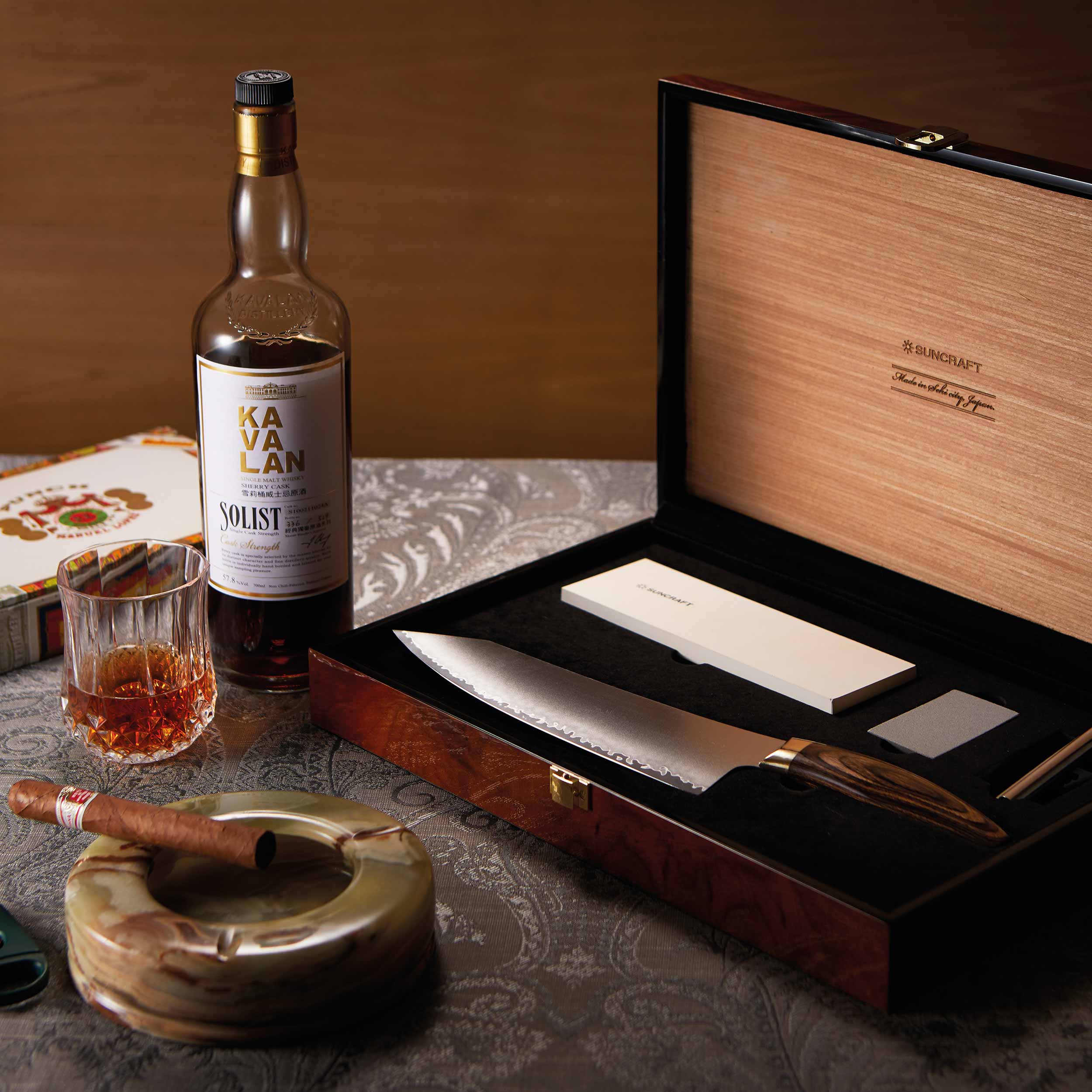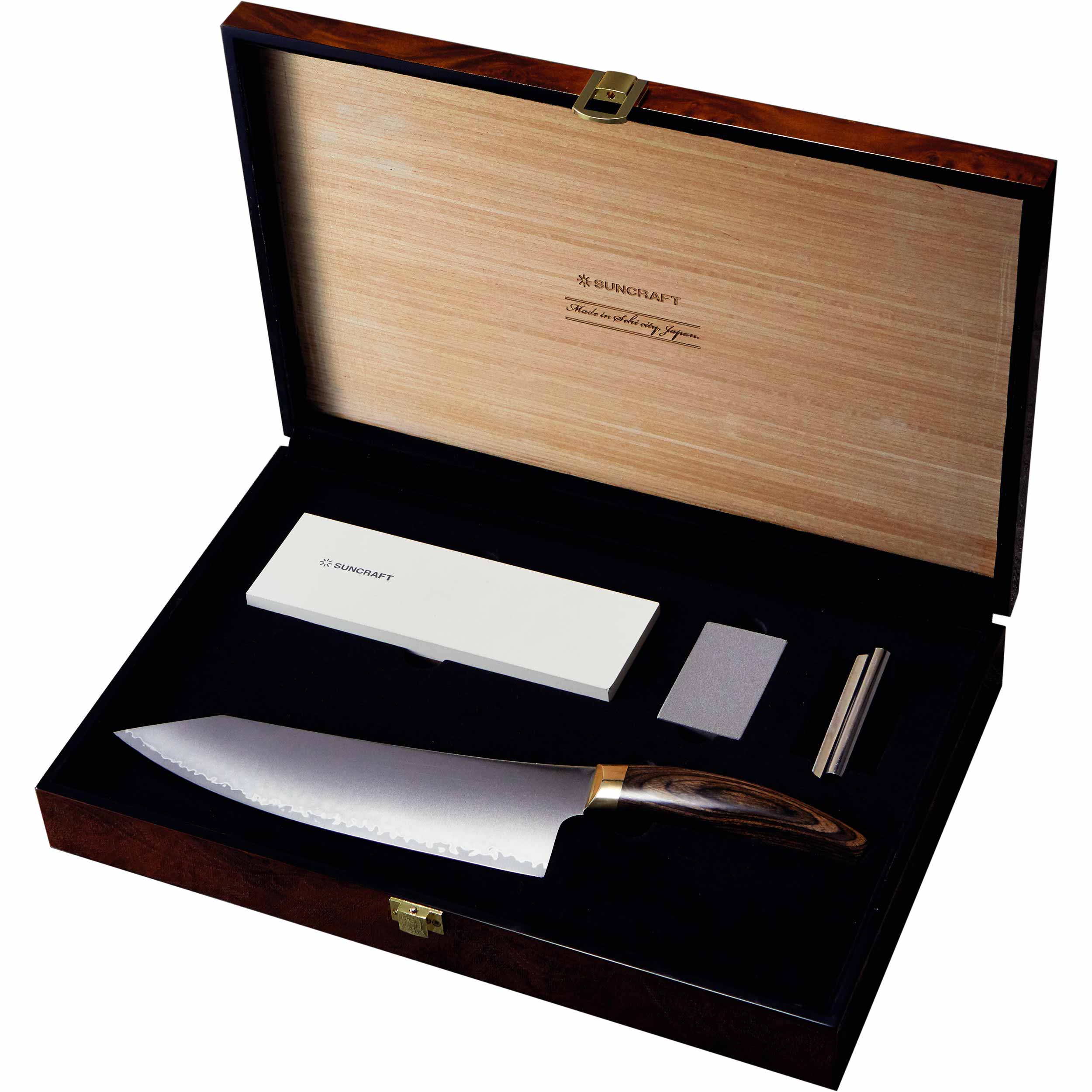 The high-quality gift box made of high-gloss lacquered wood not only provides the elegant look that distinguishes the Elegancia series, but also hides a selection of selected products - arranged around the chef's knife.
