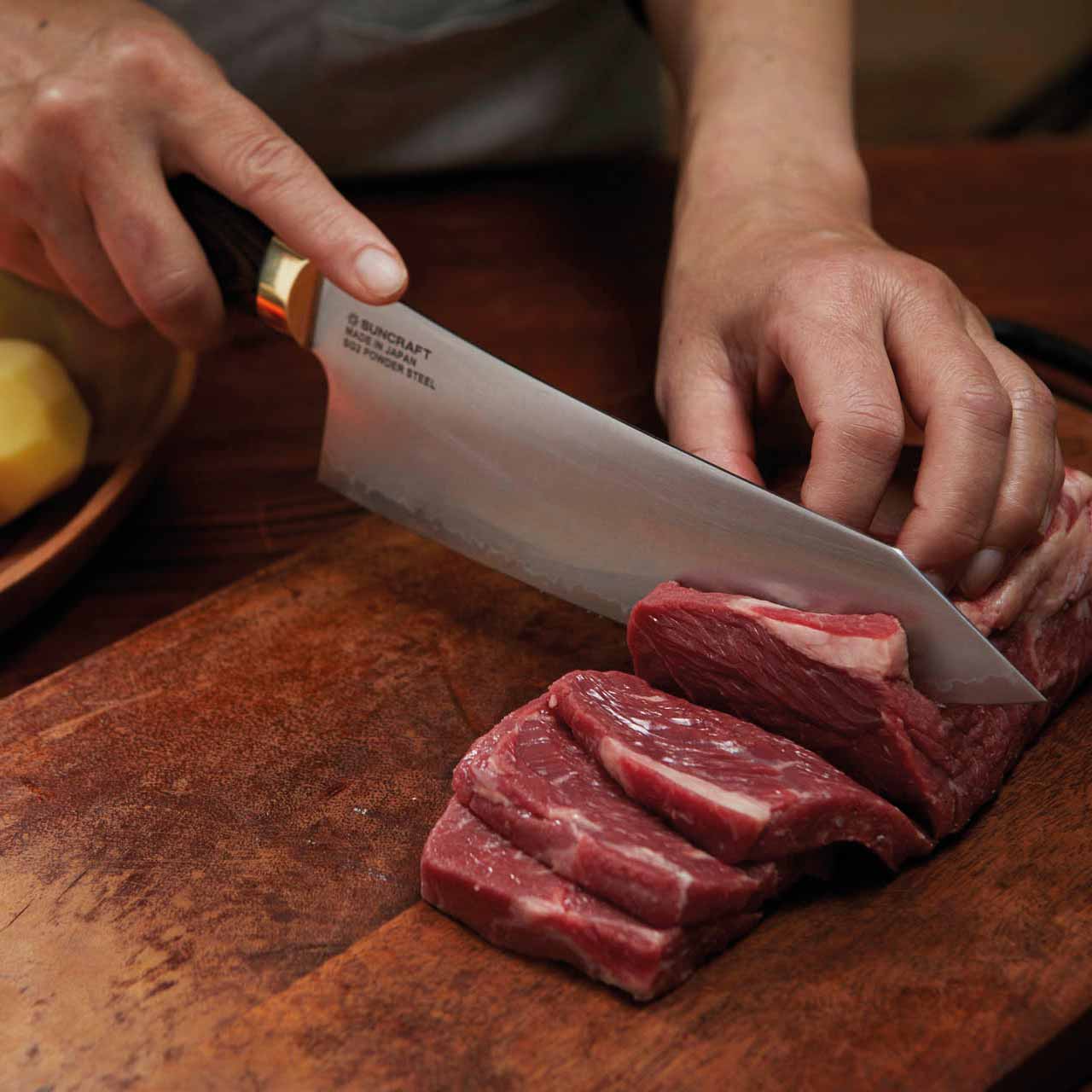 The Elegancia series impresses with its high-quality materials and elegant design. The curved handle made of walnut-colored pakka wood is embedded in a brass ferrule that takes on a patina over the years. This natural aging gives the knives an antique appearance and, in combination with the shapely blades of the Elegancia series, beguiles with an extraordinary look. Forged from SG2 powder steel and with a Rockwell hardness of 63 HRC, these blades promise a long-term cooking experience. Above all, the selected components stand for a knife collection that will continue to inspire for decades thanks to its high-quality character.