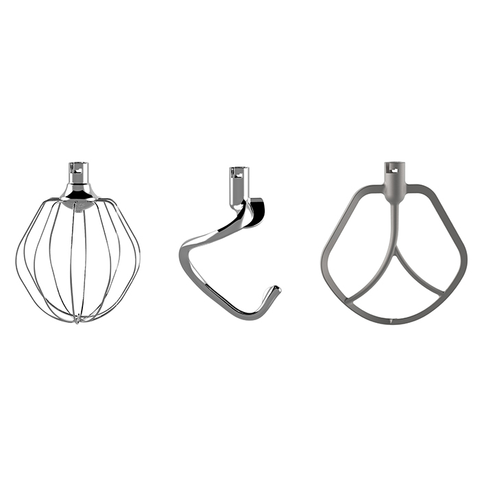 Η κουζινομηχανή συνοδεύεται από τρία εξαρτήματα: γάντζο ανάμιξης αλουμινίου για ομοιόμορφη μίξη μεγάλων ποσοτήτων, γάντζο ζυμώματος αλουμινίου για ζύμες όπως ψωμί ή ζυμαρικά, και αυγοδάρτη από ανοξείδωτο ατσάλι για αφράτα και ελαφριά μείγματα όπως μαρέγκα ή παντεσπάνι. Και τα τρία εξαρτήματα είναι μεταλλικά για μέγιστη αντοχή στον χρόνο.
