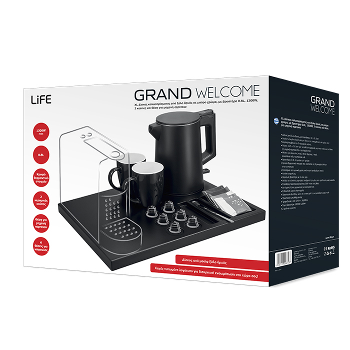 Προσφέρετε μια ευχάριστη και φιλόξενη υποδοχή στους επισκέπτες σας με τον δίσκο καλωσορίσματος LiFE Grand Welcome. Αποτελείται από μεγάλο κομψό δίσκο δρυός, διαστάσεων 42 x 31.5cm, με μοντέρνο design, μαύρο ματ βραστήρα 0.8L, πρακτικές θέσεις για κάψουλες καφέ, sticks ζάχαρης/καφέ, φακελάκια τσάι, κουταλάκια και δύο κεραμικές κούπες.