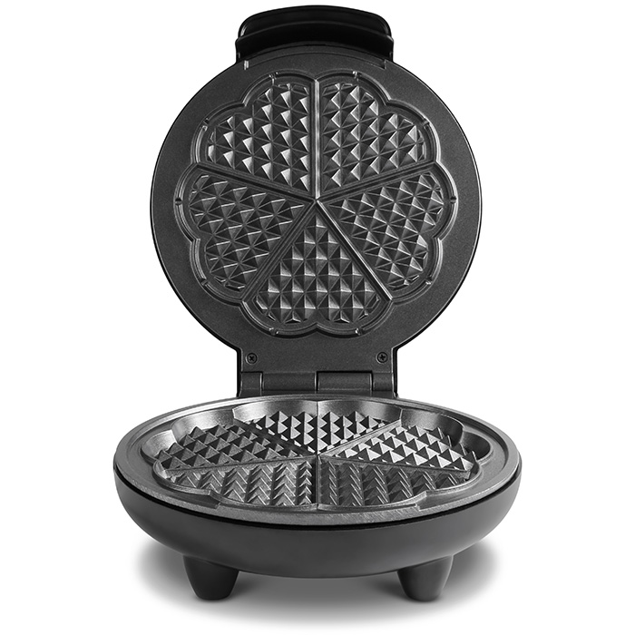 Οι αντικολλητικές πλάκες ψησίματος συνολικής διαμέτρου 19εκ., έχουν το ιδανικό βάθος για να δημιουργούν αφράτες βάφλες που κόβονται σε 5 βάφλες με σχήμα καρδιάς!