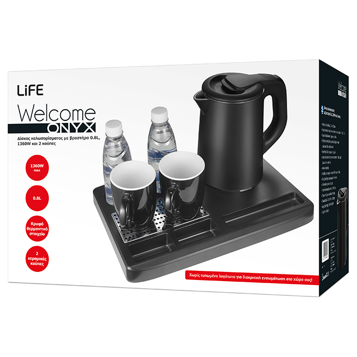 Προσφέρετε μια ευχάριστη και φιλόξενη υποδοχή στους επισκέπτες σας με τον δίσκο καλωσορίσματος LIFE Welcome ONYX. Αποτελείται από κομψό δίσκο διαστάσεων 23.4 x 35.7cm, με μοντέρνο design και πρακτικές θήκες για sticks καφέ/ζάχαρη, φακελάκια τσάι κ.ά, μαύρο βραστήρα 0.8L και δύο κεραμικές κούπες.