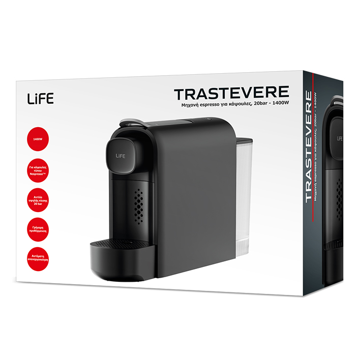 Απολαύστε εύκολα τον καφέ σας στο σπίτι με τη μηχανή espresso LiFE TRASTEVERE, τον καλύτερο σύμμαχο για κάθε λάτρη του καφέ. Κατάλληλη για κάψουλες τύπου Nespresso®, συνδυάζει ευκολία χρήσης, σύγχρονη αισθητική και υψηλή απόδοση, προσφέροντας εξαιρετικό αποτέλεσμα σε κάθε φλιτζάνι.