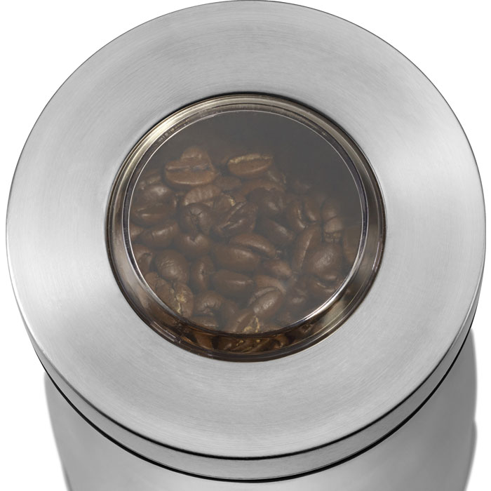 - Ανοξείδωτο καπάκι με παράθυρο για έλεγχο της διαθέσιμης ποσότητας κόκκων καφέ