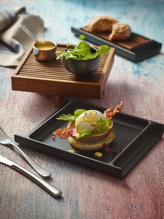 ANANTI is a versatile modular system for restaurants, made from natural materials such as walnut and oak. Tray-like cruet sets can be decoratively arranged on tables or buffet bars and staggered at different levels offering feet of various heights. Supplemented by a range of inserts made from wood, marble, terrazzo or stoneware, ANANTI is tailored to the needs of sophisticated and extraordinary presentation. Design: Carsten Gollnick.