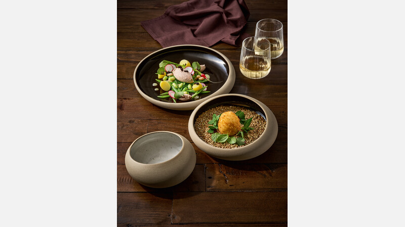 Τα σκεύη Embrace εντυπωσιάζουν με τη μορφή τους σε σχήμα φωλιάς, κατασκευασμένα από το επαναστατικό υλικό Eco-Gres®, το οποίο είναι λείο εσωτερικά και φυσικά τραχύ εξωτερικά, δημιουργεί μια εμπειρία αφής υψηλής αντίθεσης.