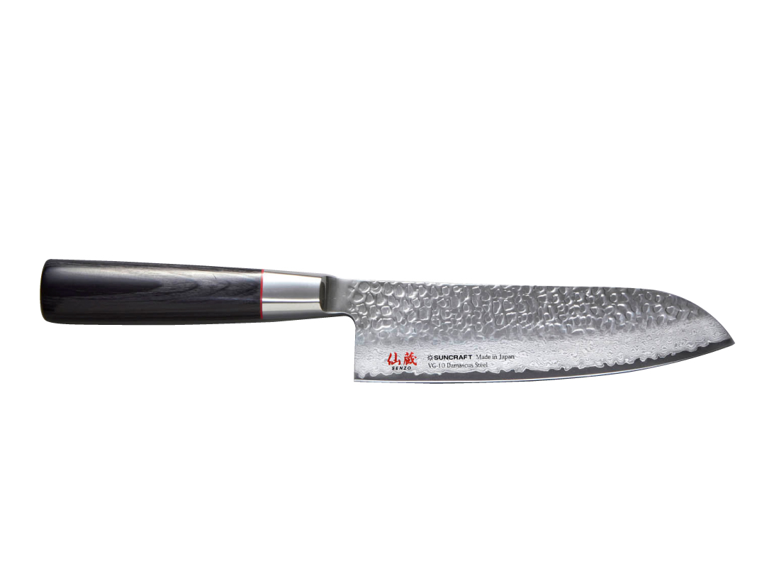 Overall knife design is simply sophisticated. There is no rivet on the handle surface. Red ring between the blade and the handle catches eyes. Hammered pattern on the blade also helps the blade glide easily through food without sticking.