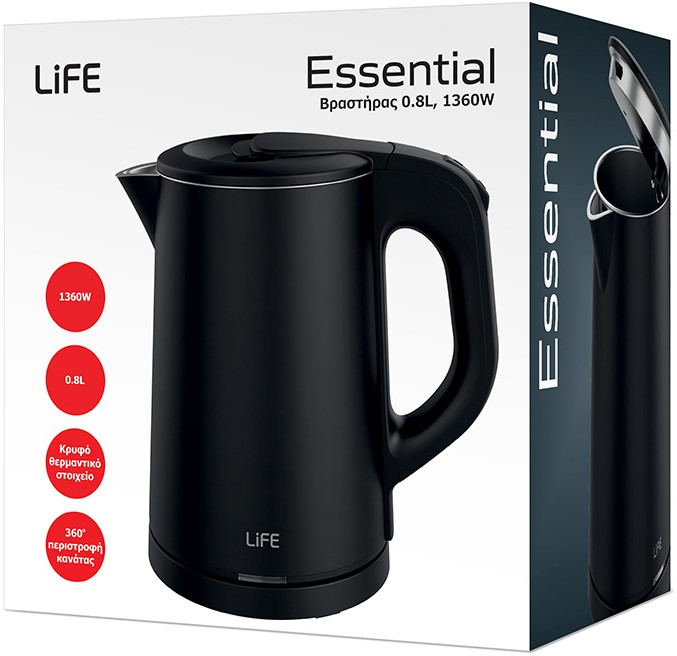 The LIFE Essential Kettle has a maximum capacity of 0.8L and has a hidden heating element that prevents scale formation on the resistance, for a longer life.